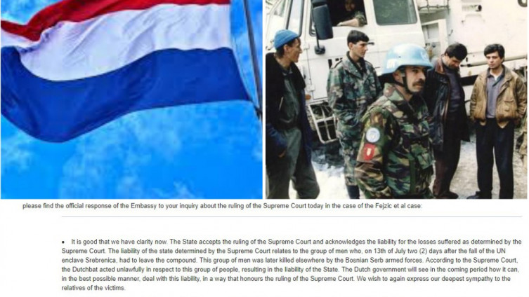 Naša vlada je 2002. godine preuzela političku odgovornost. Dobro je imati na umu ko su krivci za genocid u Srebrenici - vojska bosanskih Srba u to vrijeme. Još od 1995. godine mnogi su, uključujući i Holandiju, radili naporno na procesuiranju počinilaca. To je, između ostalog, rezultiralo osudama Ratka Mladića i Radovana Karadžića u Međunarodnom sudu pravde u Hagu. Želimo naglasiti da su vojnici holandskog bataljona svoj posao uradili s velikim naporima, pod izuzetno teškim okolnostima - kazali su nam iz Holandske ambasade.