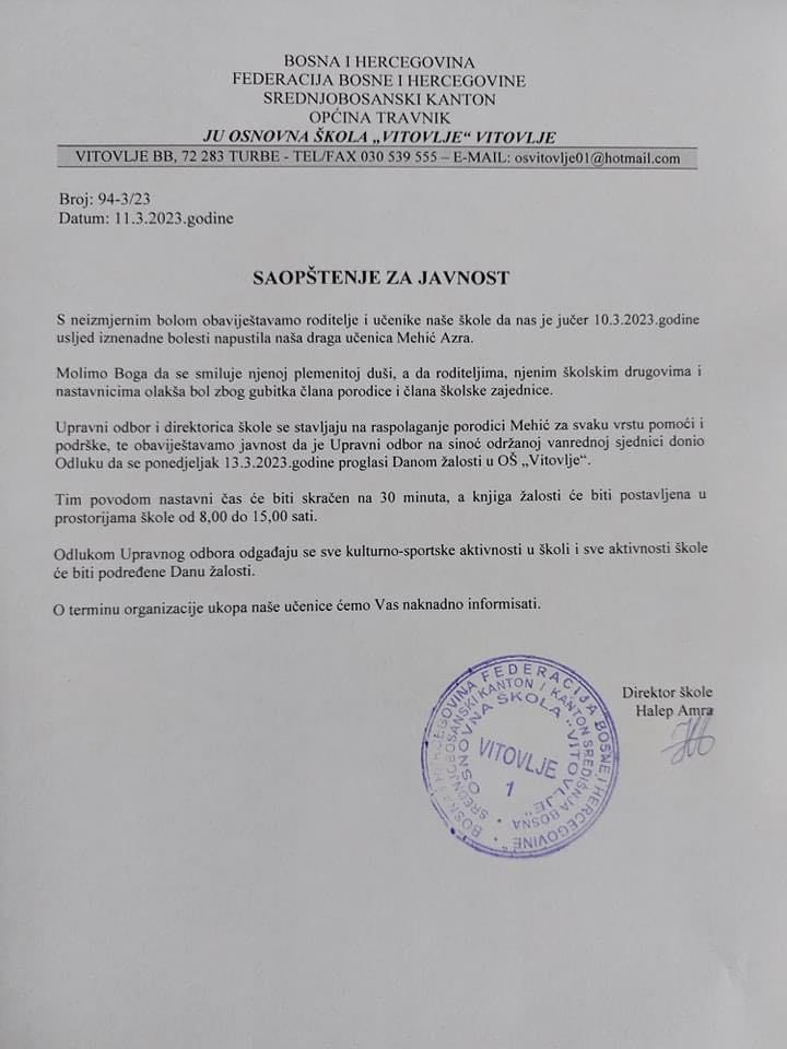 Upravni odbor i direktorica škole se stavljaju na raspolaganje porodici Mehić za svaku vrstu pomoći i podrške, te obaviještavamo javnost da je Upravni odbor na sinoć održanoj vanrednoj sjednici donio Odluku da se ponedjeljak 13.3.2023. godine proglasi Danom žalosti u OŠ "Vitovlje". Tim povodom nastavni čaš će biti skraćen na 30 minuta, a knjiga žalosti će biti postavljena u prostorijama škole od 8 do 15 sati.