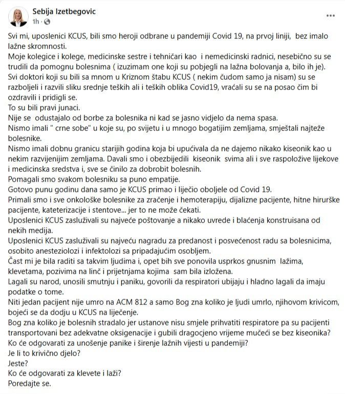 - Nismo imali "crne sobe" u koje su, po svijetu i u mnogo bogatijim zemljama, smještali najteže bolesnike. Nismo imali dobnu granicu starijih godina koja bi upućivala da ne dajemo nikako kiseonik kao u nekim razvijenijim zemljama. Davali smo i obezbijedili kiseonik svima, ali i sve raspoložive lijekove i medicinska sredstva i, sve se činilo za dobrobit bolesnih. Pomagali smo svakom bolesniku sa puno empatije - napisala je u dužem statusu na Facebooku Izetbegović.