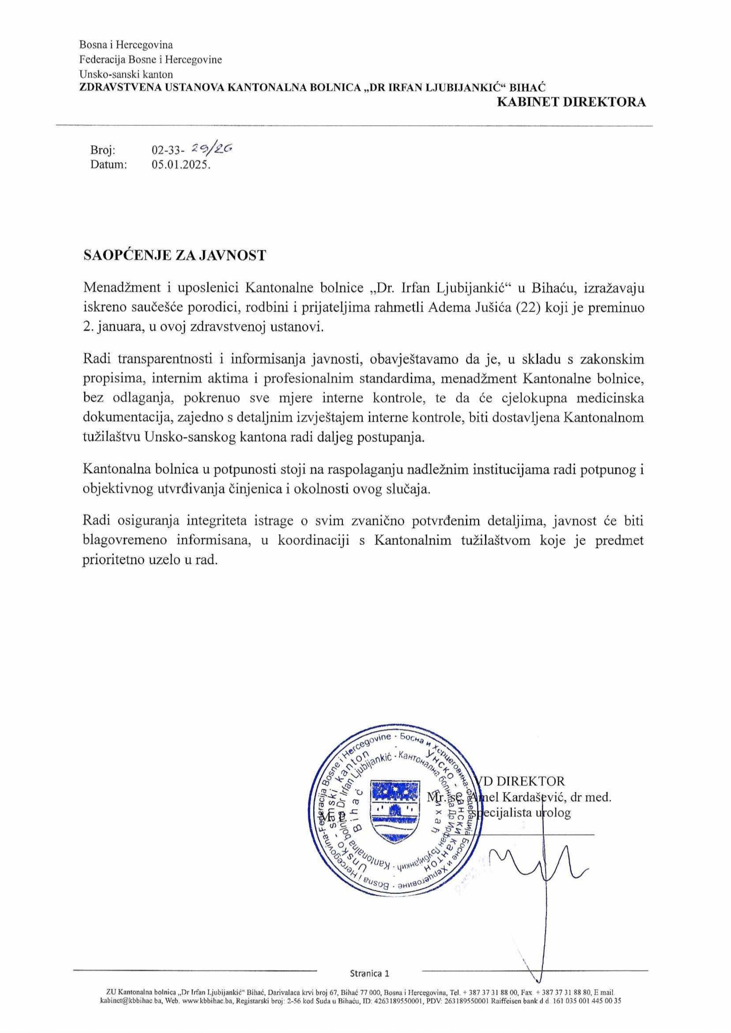 Nakon što je Tužilaštvo Unsko-sanskog kantona otvorilo predmet povodom smrti 22-godišnjeg Adema Jušića, koji je preminuo u Kantonalnoj bolnici Dr. Irfan Ljubijankić u Bihaću, oglasili su se iz ove zdravstvene ustanove.