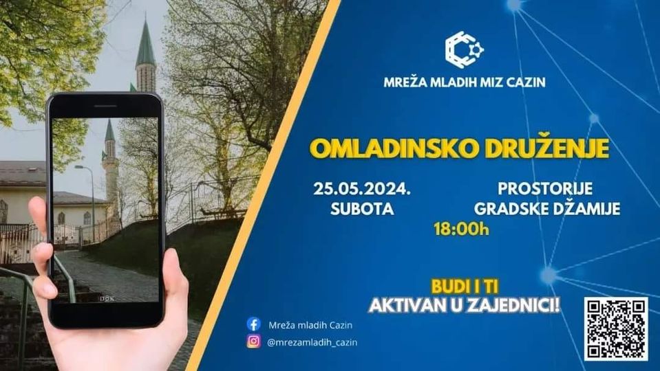 CAZIN 24 May, 2024 - 15:33 / Uredio: AlmaK. / 0 Comments Omladinsko druženje u Cazinu Omladinsko druženje u organizaciji Mreže mladih Cazin.Druženje će se održati subotu 25.05.2024.godine, prostorije Gradske džamije sa početkom u 18:00 sati i otvoreno za sve mlade ljude. mreza mladih cazin Related Articles CAZIN 05 Dec, 2025 Saobraćajka u Cazinu: Kamion završio pored puta, saobraćaj otežan - evo detalja CAZIN 05 Dec, 2025 Veliki duel u Cazinu: Krajina protiv Gruda u 7. kolu Premijer lige BiHc CAZIN 05 Dec, 2025 Zlatna Cazinjanka: Belma Mahmutagić među najboljim studentima Univerziteta CAZIN KRAJINA 04 Dec, 2025 Saobraćajna nesreća u Cazinu: ‘Vozač udario više vozila u pokretu i pobjegao’ CAZIN 04 Dec, 2025 Saobraćajna nesreća u Cazinu: Vozilo završilo pored ceste CAZIN 04 Dec, 2025 Udes u Cazinu, vozilo završilo van puta - evo detalja
