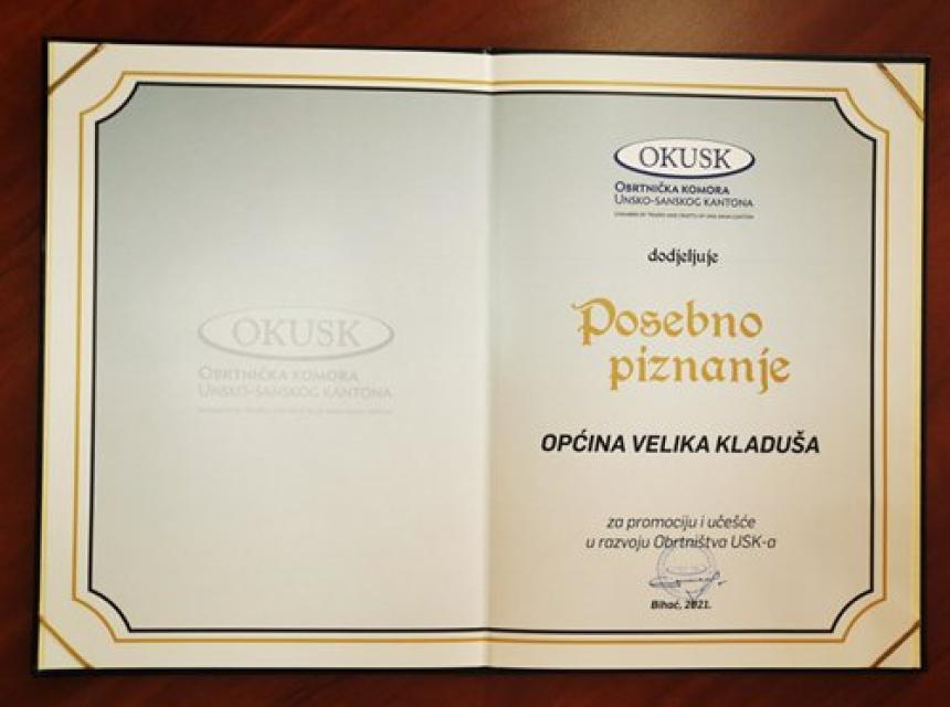Obrtnička komora Unsko-sanskog kantona dodijelila je Posebno priznanje Općini Velika Kladuša za promociju i učešće u razvoju Obrtništva USK-a. Naime, Općina Velika Kladuša tokom protekle godine pružila je značajnu financijsku podršku razvoju poduzetništva i obrtništva na području općine, pa je tako prošlogodišnjim Budžetom u ovu namjenu uloženo 200.000 KM. Rezultat navedenog ogleda se u projektu „Razvoj i implementacija programa zapošljavanja prekvalifikacijom prema potrebama tržišta“, čiji su partneri Obrtnička komora USK-a, općina Velika Kladuša, JU Služba za zapošljavanje USK-a, dvije obrazovne institucije: Biotehnički fakultet Univerziteta u Bihaću i JU I srednja škola „Dr. Husein Džanić“, te tri kladuške firme. Implementacija je vršena uz finansijsku pomoć USAID-a u BiH i Međunarodne organizacije rada, a sve s ciljem razvoja poduzetništva i radnog osposobljavanja više od 100 osoba, bilo da se radi o prekvalifikaciji, pronalasku posla ili pokretanju vlastitih biznisa. Fokus je stavljen na stručno osobobljavanje radnika za rad na CNC mašinama. Savjetnik Općinskog načelnika, Ervin Abdić.