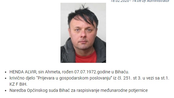 Ministarstvo unutrašnjih poslova Unsko-sanskog kantona postavilo je na web stranicu Vlade USK-a međunarodnu potjernicu po Naredbi Općinskog suda u Bihaću.