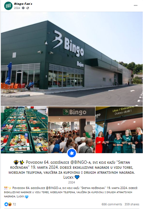 U martu i aprilu 2024. godine na Facebooku su se ponovo dijelile lažne nagradne igre pripisane trgovačkom lancu Bingo. U jednoj od viralnijih objava, podijeljenoj na Facebook stranici nazvanoj 𝘽𝙞𝙣𝙜𝙤-𝙛𝙖𝙣'𝙨 15. marta 2024. godine, navodi se sljedeće:
