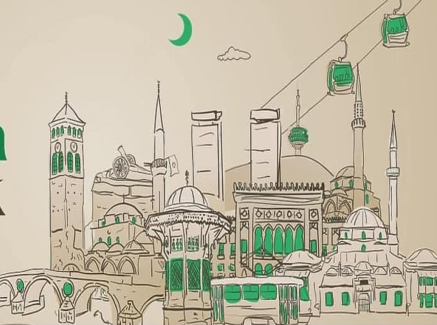 Također, na ilustraciji su nacrtane i najpoznatije džamije u Sarajevu.