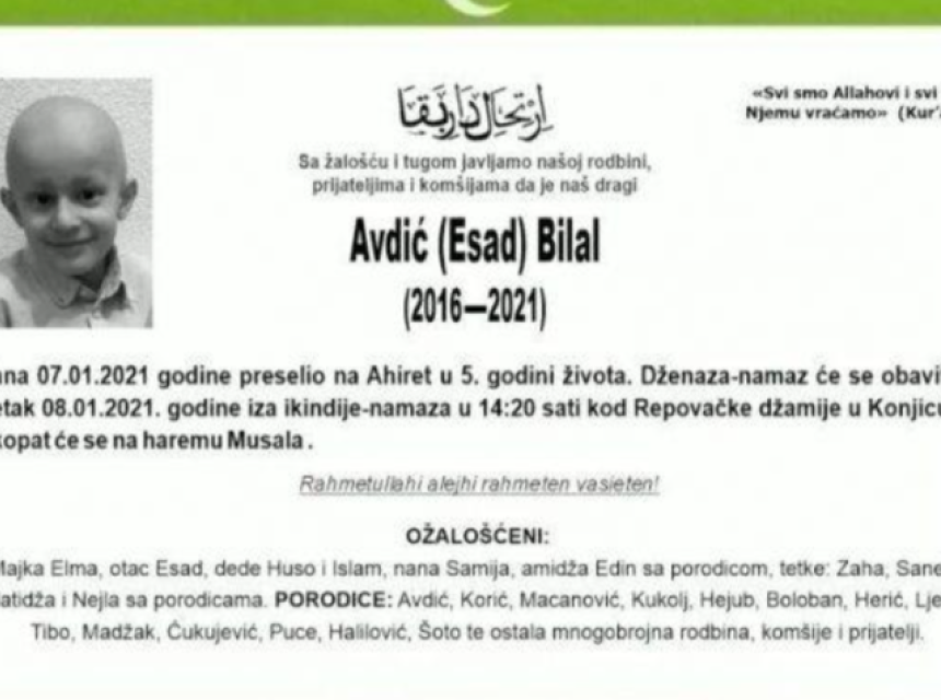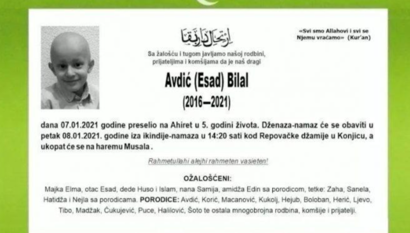 Molim Allaha, dzelle se'nuhu, da se mom Bilalu smiluje, da mu otvori džennetska vrata, da mome Esadu i meni podari sabura i snage i sastavi nas u Firdevsu sa nasim Bilalom InshaAllah…”, napisala je majka malog Bilala na svom Facebook profilu.