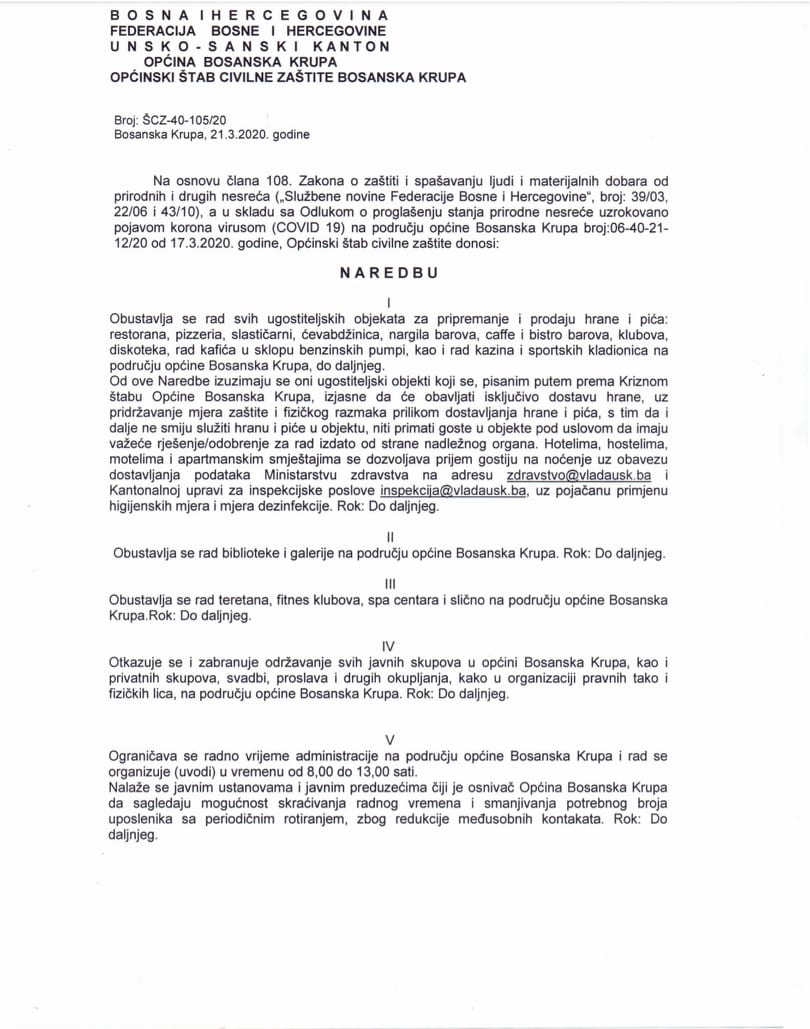Donesena je i naredba o zabrani zadržavanja na javnim mjestima više od tri osobe, te zabrani vožnje u istom vozilu za više od dvije osobe. Sve naredne stupaju na snagu danom donošenja i primjenjuju se od 21. 3. 2020. godine od 12.00 sati. Za njihovo provođenje, svako u svojoj nadležnosti, bit će zaduženi pripadnici Policijske stanice Bosanska Krupa, općinski komunalni inspektor, te druga ovlaštena lica. Općinski štab civilne zaštite Bosanska Krupa poziva građane na dosljedno poštovanje naredbi.
