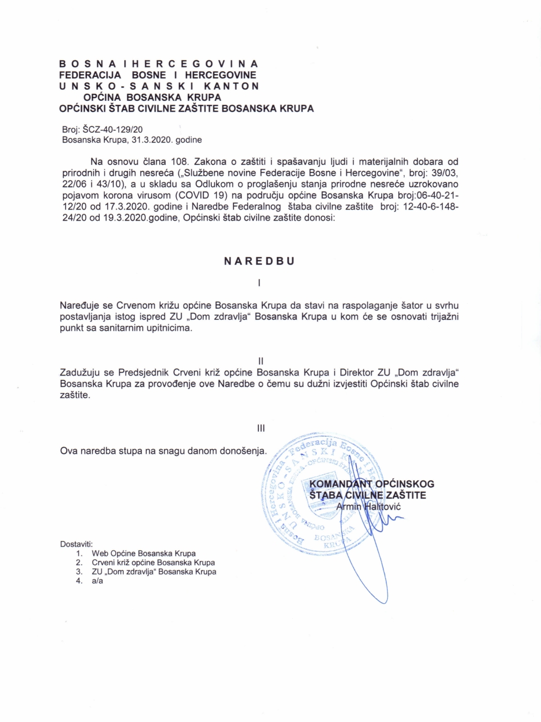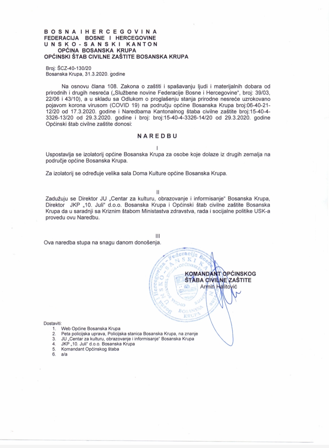 Ovu naredbu, u saradnji sa Kriznim štabom Ministarstva zdravstva, rada i socijalne politike USK, provest će direktor JU „Centar za kulturu, obrazovanje i informisanje“, direktor JKP „10. Juli“ i Općinski štab civilne zaštite. Crvenom križu općine Bosanska Krupa naređeno je da stavi na raspolaganje šator u svrhu postavljanja istog ispred ZU „Doma zdravlja“ Bosanska Krupa u kojem će se osnovati trijažni punkt sa sanitarnim upitnicima. Za provođenje one naredbe zaduženi su predsjednik Crvenog križa i direktor Doma zdravlja. Štab je na današnjoj sjednici odobrio prenos sredstava Domu zdravlja Bosanska Krupa u iznosu od 10 hiljada KM za opremanje i nabavku sredstava neophodnih za izolatorij u kojem će, ukoliko ih bude, boraviti pacijenti pozitivni na koronavirus.