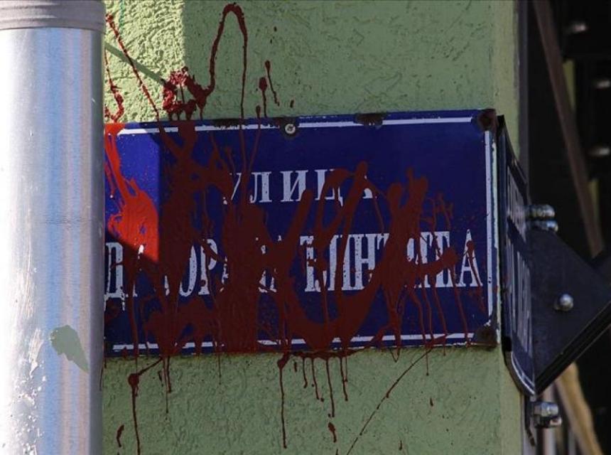 Table s imenom ubijenog predsednika Vlade Srbije, koje se nalaze u blizini Filozofskog fakulteta, osvanule su jutros prekrivene crvenom farbom, na 15. godišnjicu od ubistva Đinđića.