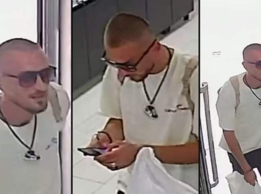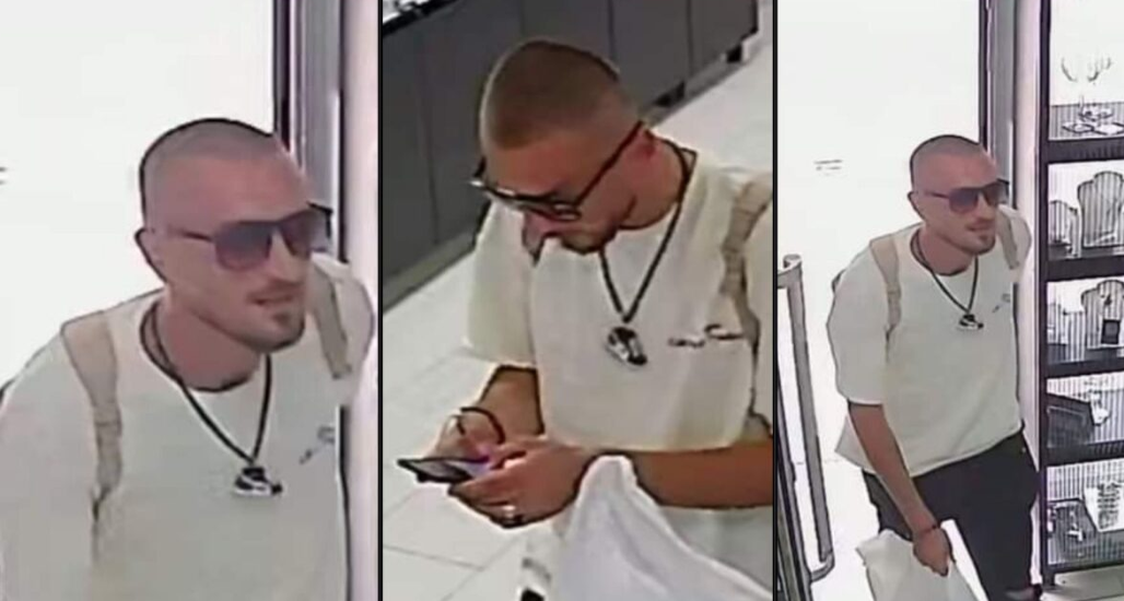 Na objavljenim slikama s nadzornih kamera vidi se muškarac sa kratko ošišanom kosom, naočalama i bijelom majicom kako ulazi u trgovinu i obavlja transakciju na sumnjiv način.
