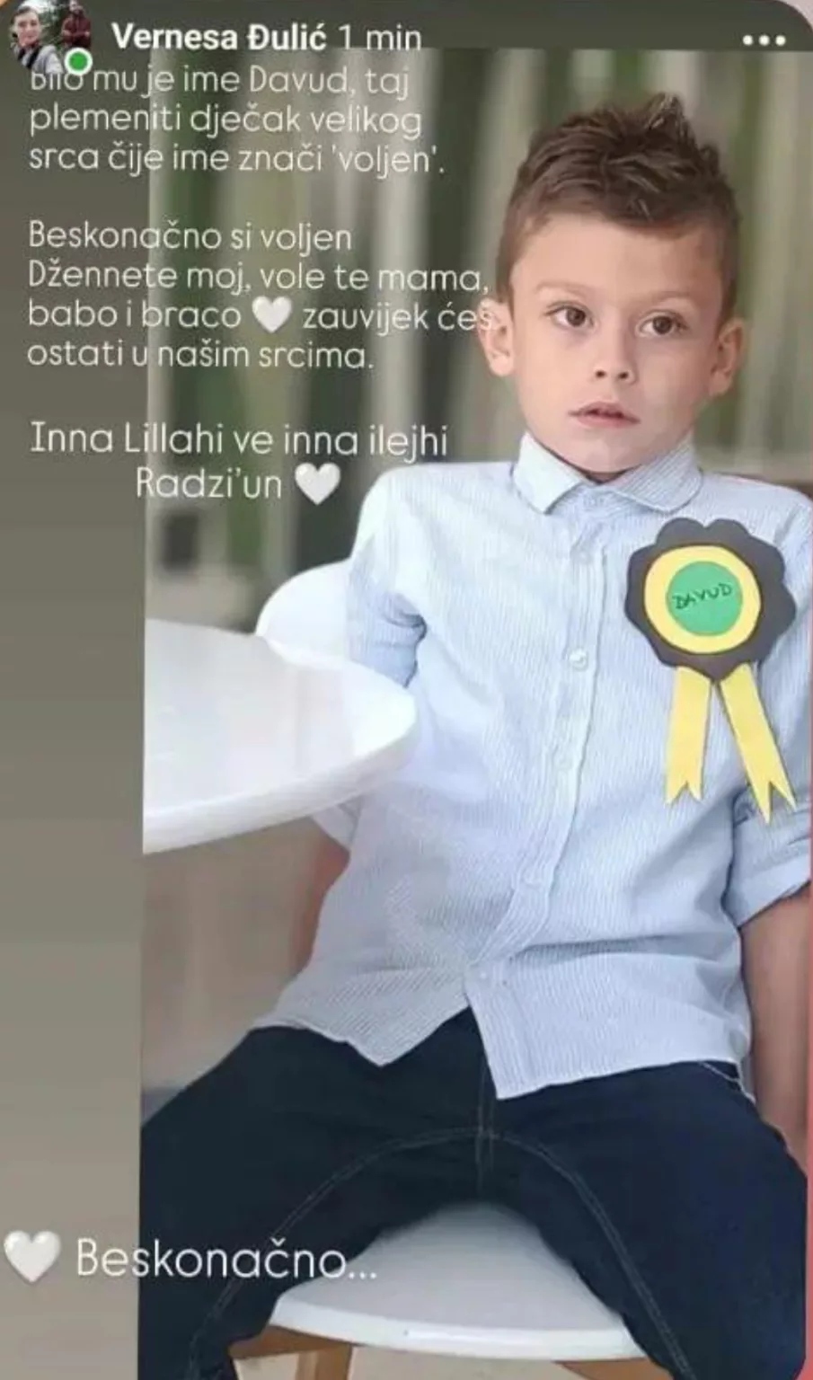 „Ostala je prazna i jedna sarajevska školska klupa, jedan đak prvak je ostavio sve tuge i boli koje su ga prebrzo odvojile od njegovih najvoljenijih. Ostala je uplakana i slomljena jedna mama, ponosna što ga je imala za sina ovih sedam godinica. Moja Vernesa… moja najbolja, najiskrenija… Dovim da im dragi Allah dž.š. podari sabur i strpljenje da zajedno prevaziđu ovu tugu i bol, a vjera u duši je ta koja će ih održati na životu… Tamo sad ne boli. I ljepše ti je… i s osmijehom ćeš dočekati svoje roditelje u Džennetu, inšAllah.“
