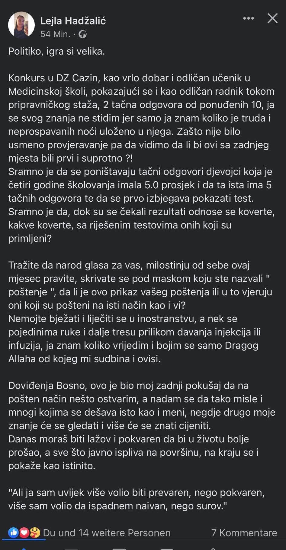 “Politiko, igra si velika”, započela je svoj status na FB djevojka iz Cazina koja se na konkursu javila za posao u Domu zdravlja Cazin.