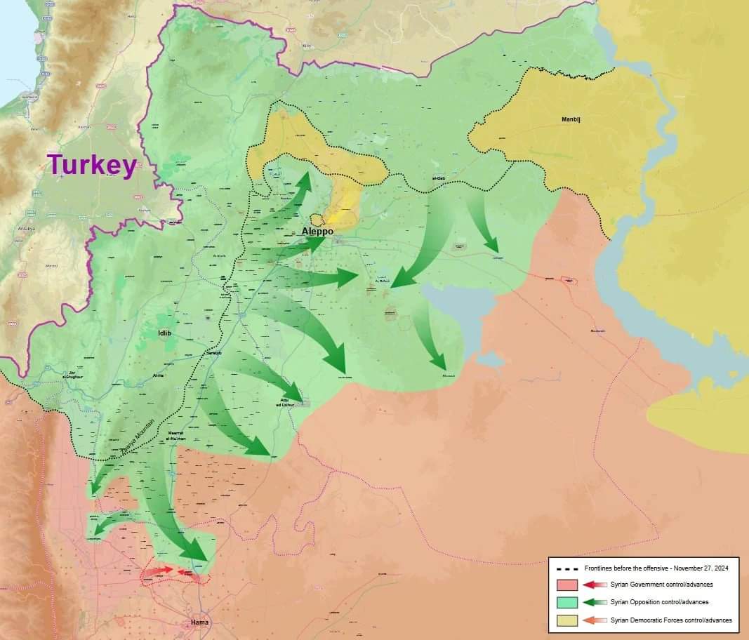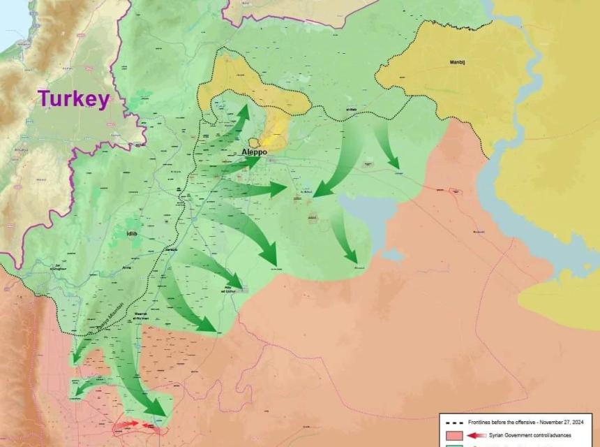 U petak navečer HTS, savez pobunjeničkih boraca predvođen bivšom sirijskom granom Al-Qaide, proglasio je potpunu kontrolu nad gradom Alepom nakon brze ofanzive koja je preplavila režimske snage. Napad je počeo u zapadnom zaleđu Alepa i Idliba, a opozicione snage su za nekoliko dana zauzele više od 80 sela i gradova, uključujući ključnu infrastrukturu poput Međunarodnog aerodroma u Alepu i autoput M5, važnu rutu koja povezuje Damask sa sjevernom Sirijom.