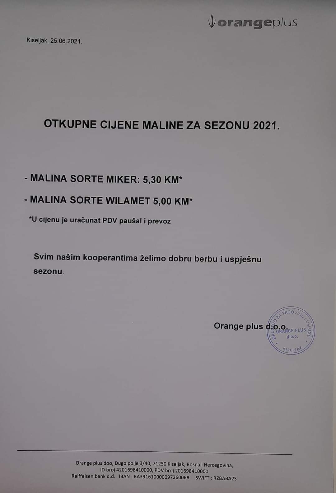 Jučer je firma Orange plus iz Kiseljaka objavila nove otkupne cijene maline koje iznose 5,00 KM vilamet i 5,30 KM miker.
