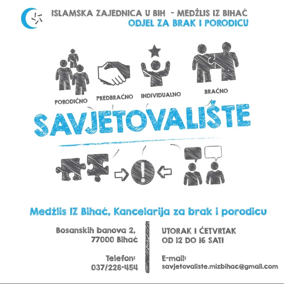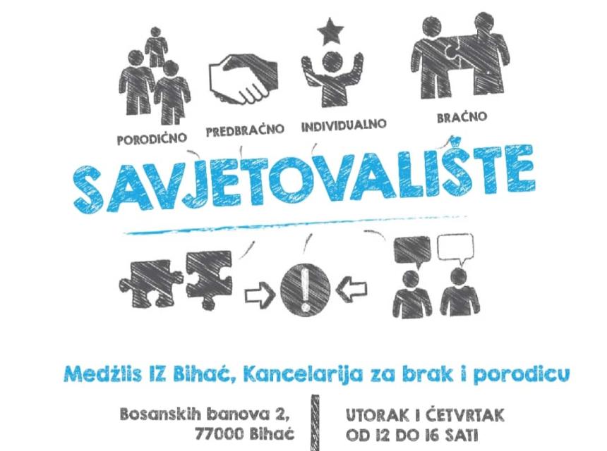 Odjel za brak i porodicu Medžlisa IZ Bihać od sada nudi besplatno Savjetovalište za brak i porodicu koje u širem smislu podrazumijeva: individualno, predbračno, bračno, porodično i savjetovanje o vjerskim pitanjima. Odjel za brak i porodicu Uprave za vjerske poslove Rijaseta Islamske zajednice u Bosni i Hercegovini ima za cilj pružanje podrške porodici i njenoj afirmaciji kao temelju društva.
