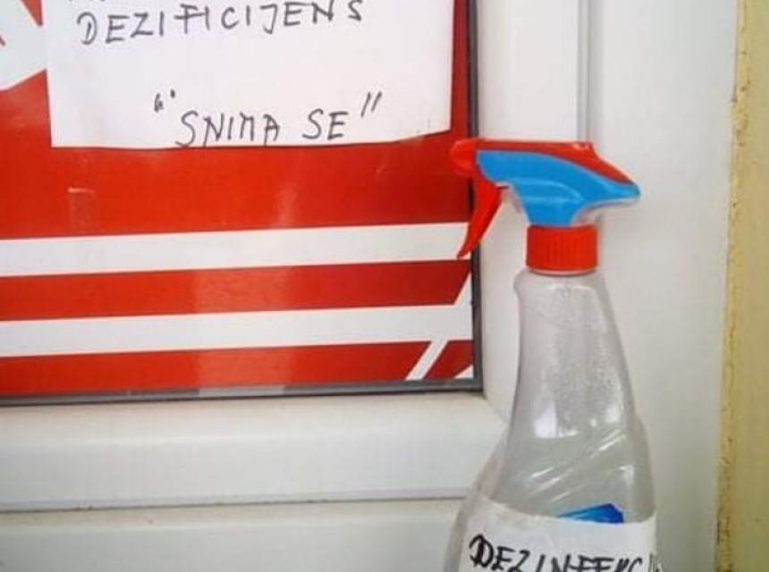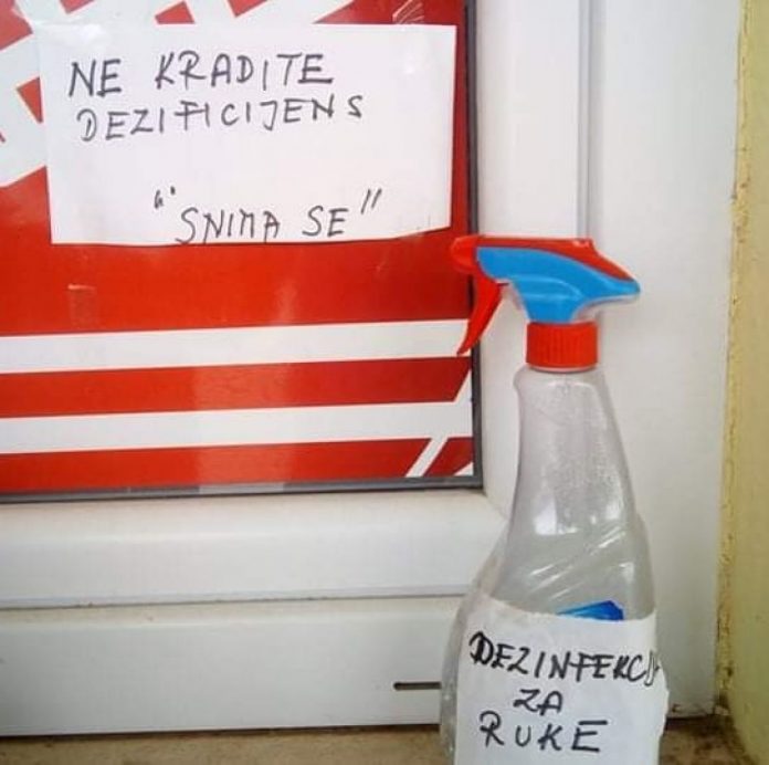 “Ne kradite dezificijens. Snima se!,” poruka je koja stoji uz dezinficijens.