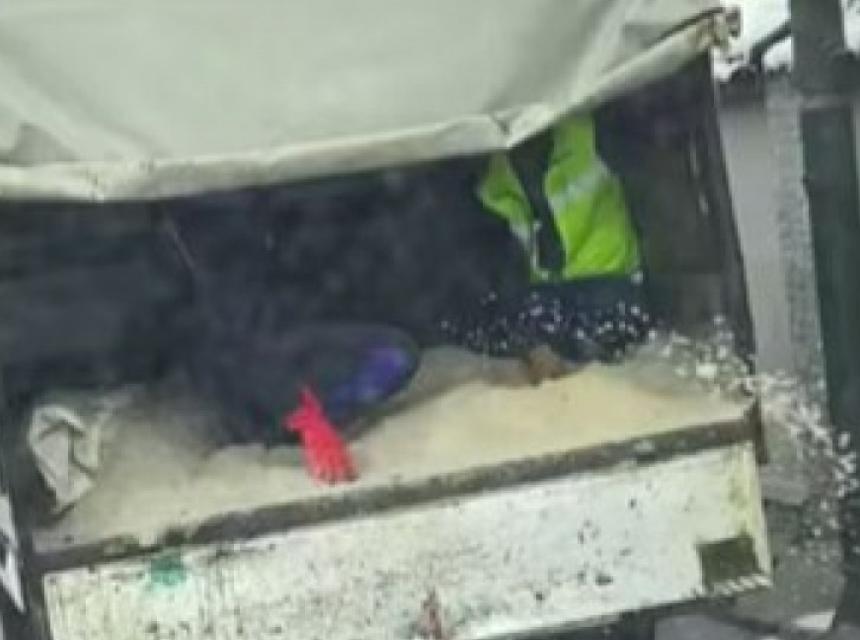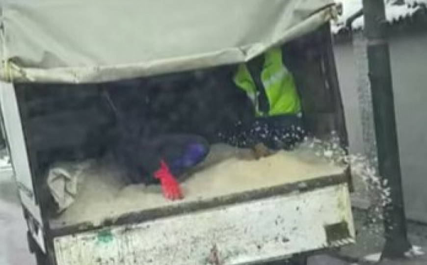 Na snimku zabilježenom u sarajevskoj općini Ilidža, u Kasindolskoj ulici, vidi se kako radnici preduzeća, čije ime se ne vidi, rukama posipaju so po ulici iz prikolice kamiona.
