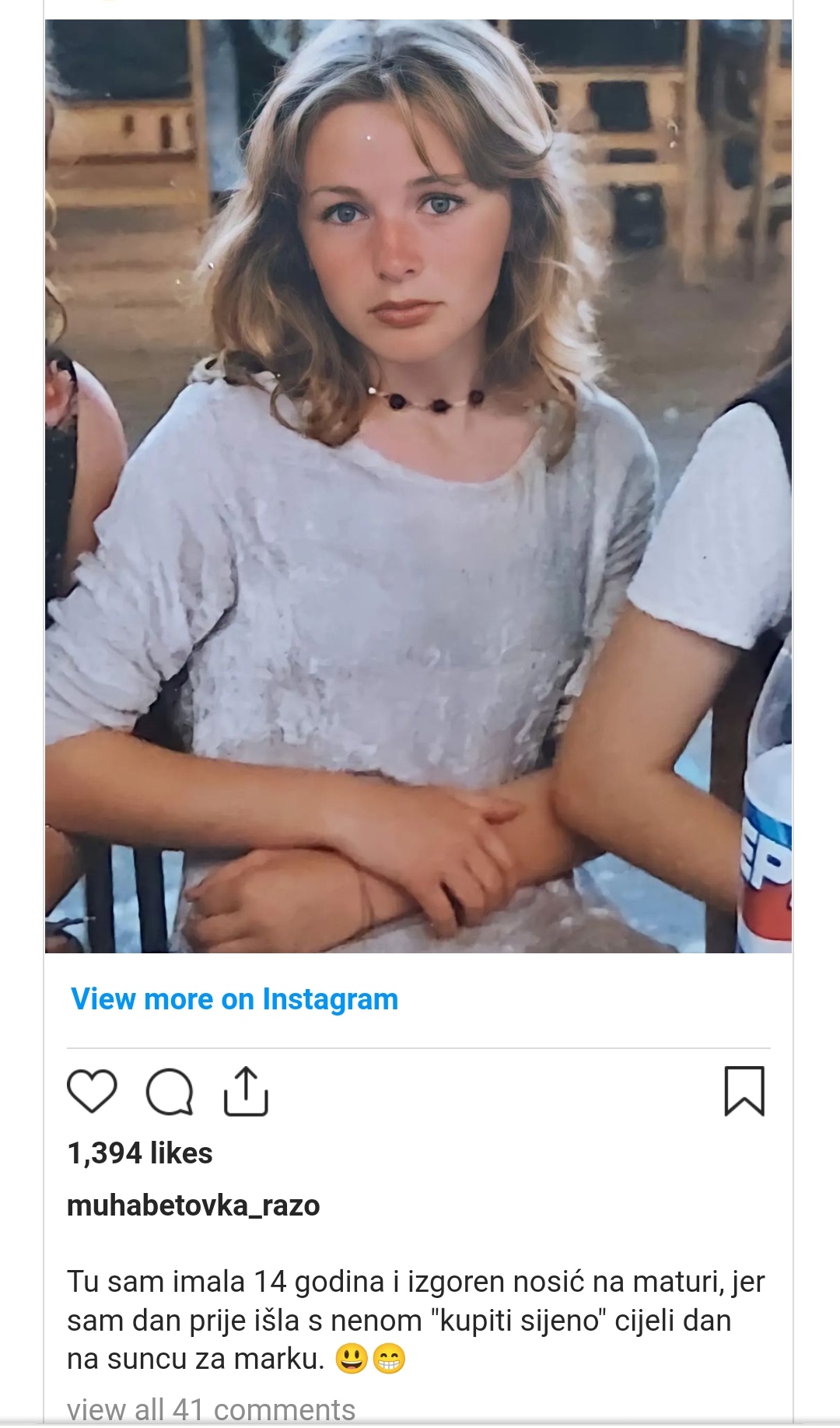 – Tu sam imala 14 godina i izgoren nosić na maturi, jer sam dan prije išla s nenom “kupiti sijeno” cijeli dan na suncu za marku, napisala je Razija uz fotografiju mlade sebe.