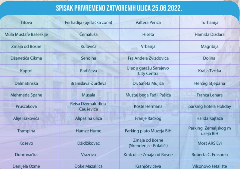 Podsjećamo, ruta kretanja povorke je Vječna vatra - Ulica Maršala Tita - Zmaja od Bosne - bina između Historijskog i Zemaljskog muzeja, a važno je napomenuti da će biti zatvorene sve bočne ulice oko ove glavne rute kretanja.