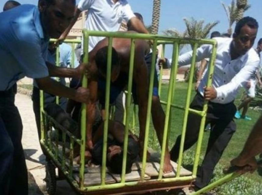 "Fotografija kojom se prikazuje da je osumnjičeni bio zatvoren nakon smrtonosnog ubadanja u Hurgadi, na plaži u Egiptu", piše u opisu fotografije koja objavljena na Twitteru.