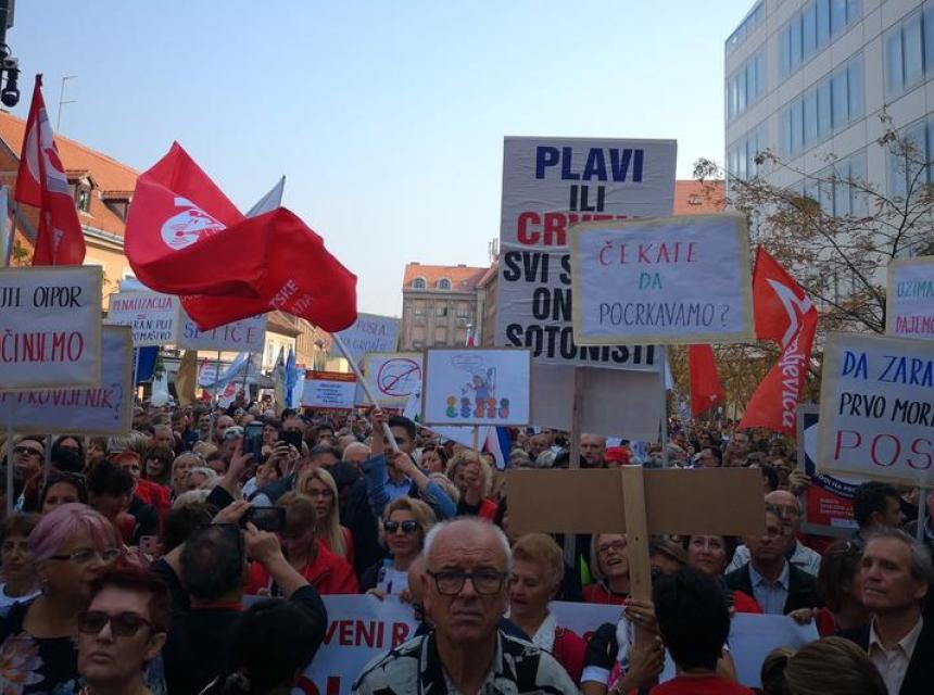 12.00 - Počeo je prosvjed na Europskom trgu. Među brojnim okupljenim sindikalistima našli su se i političari i to čelnik SDP-a Davor Bernardić i njegov stranački kolega Gordan Maras.