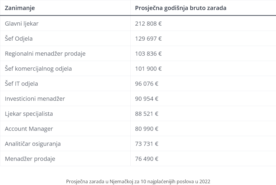 Donja tabela prikazuje 10 zanimanja koja su najviše plaćena u Njemačkoj sa prosječnim godišnjim zaradama: