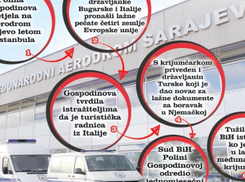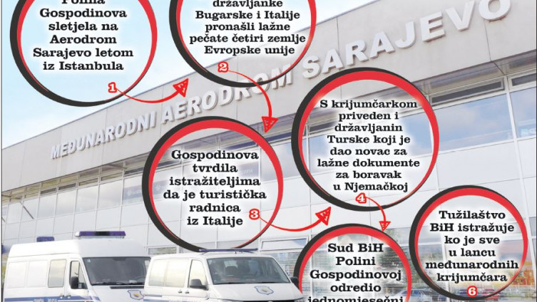 Gospodinova je letom iz Istanbula stigla u Sarajevo u četvrtak, 15. avgusta, a tokom pretresa kod nje su pronađeni pečati za krivotvorenje dokumenata za četiri države Evropske unije.