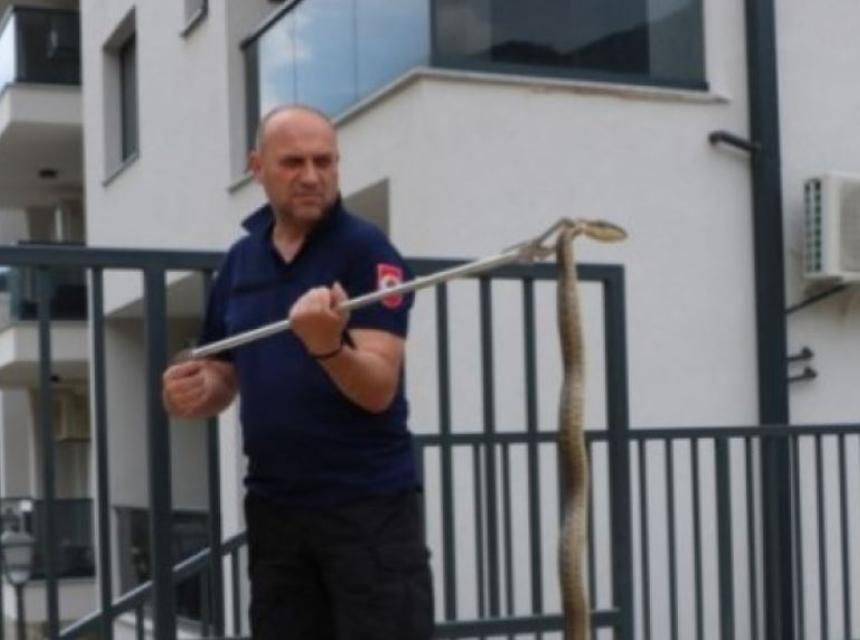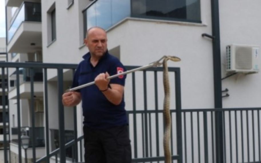 Ogromna zmija, dugačka preko metar i po, prestravila je jutros mještane trebinjskog naselja Travunija, kada su je primijetili na ulazu u zgradu.