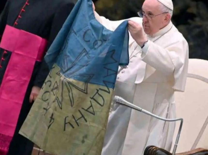 - Jučer su mi, upravo iz Buče, donijeli ovu zastavu - rekao je papa Franjo i razmotao je i podigao pred nekoliko hiljada vjernika, što je izazvalo aplauz. Zastava je imala i natpis.