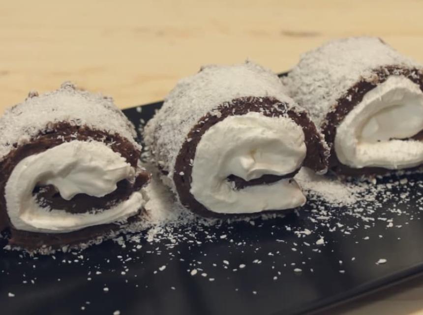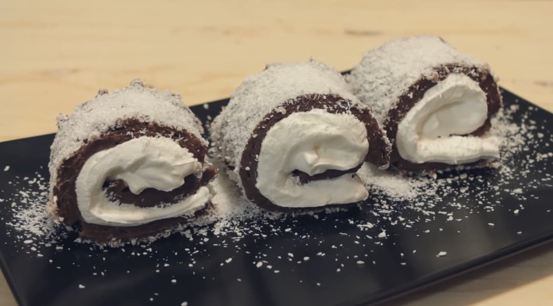 Ulupajte slatku pavlaku pa premažite preko “pudinga” . 150 – 200 gr šlaga ulupanih sa mlekom ili kiselom vodom može da zamijeni slatku pavlaku. Isjecite u štrafte i uvijajte do pola štrafte. Uvijete u krug, pa presiječete. Desnom rukom držite a lijevom nožem presječete.
