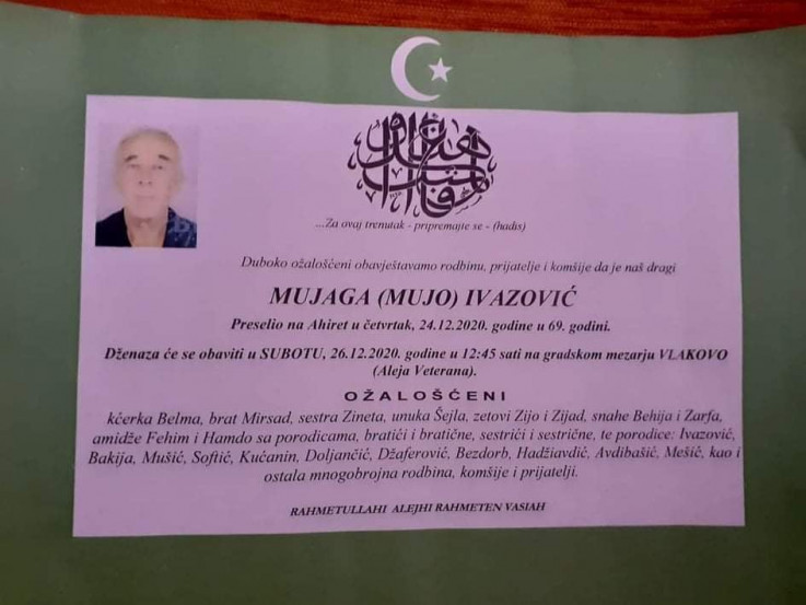 Mujaga Ivazović, penzionisni policajac koji je bio osuđen na šest godina zatvora jer je 29. aprila prošle godine u stanu u sarajevskom naselju Saraj-Polje s tri hica iz pištolja ubio sina Semira, preminuo je, saznaje „Avaz“.
