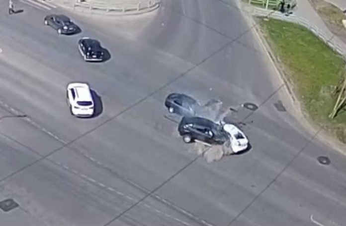 Na snimci se vidi kako crni BMW X6 u punoj brzini ulijeće u raskrsnicu i zabija se najprije u Ladu Vestu, a potom u Škodu Octaviju od koje se odbio u Volgu.