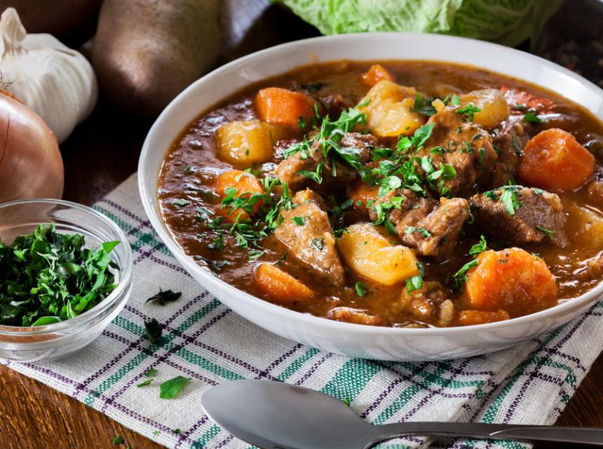 - Dodajte osam dl vode i kuhajte poklopljeno oko 50 minuta, dok meso ne omekša. Po potrebi dolijte još vode. Škrobno brašno razmutite u malo hladne vode i umiješajte u čorbu. Kratko prokuhajte, umiješajte ajvar i pospite sjeckanim peršunom.