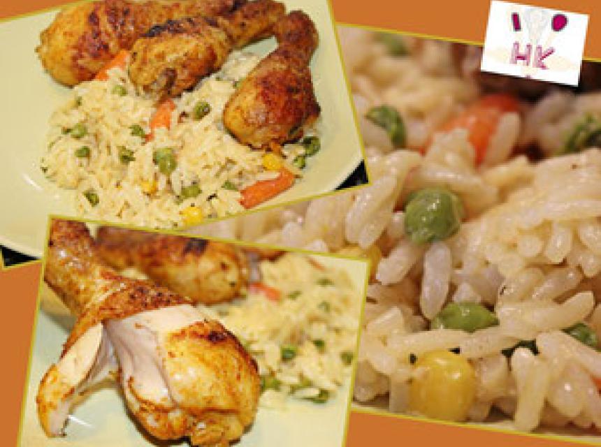 A dok se riža peče, u većoj tavi zagrijte ulje, izvadite piletinu iz frižidera i ispržite je na srednjoj vatri na svakoj strani po 5-7 min da uhvati boju. Ne mora biti sasvim pečena. Kad je piletina spremna i riža skoro upila vodu, poredajte piletinu po vrhu riže.