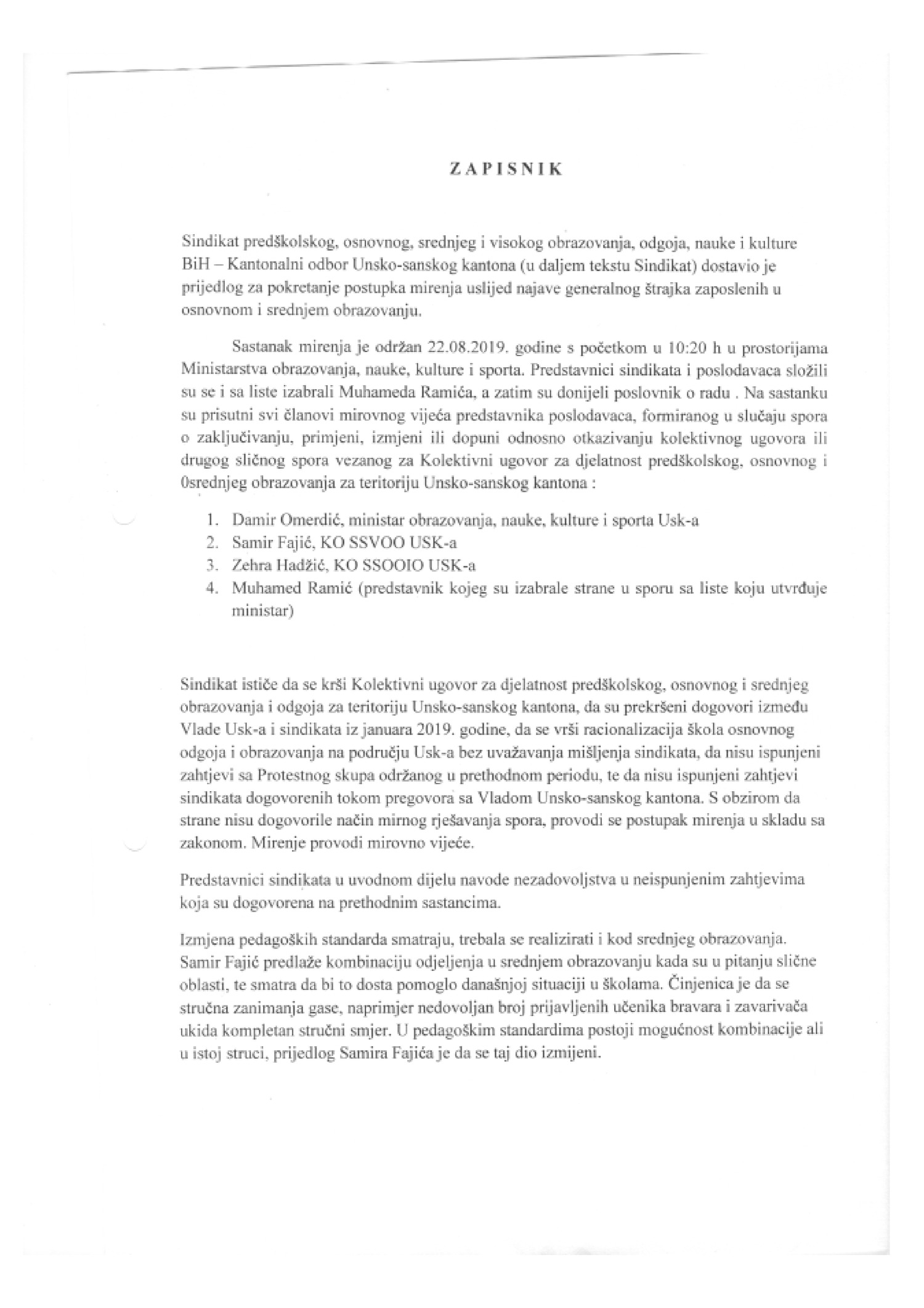 Vođeni namjerom da cijeli proces mirenja bude transparentan u prilogu su zapisnici sa sastanaka mirovnog vijeća. U ime Vlade USK, obraćam se prosvjetnim radnicima sa direktnim prijedlogom koji im njihovi predstavnici, očito nisu prenijeli.