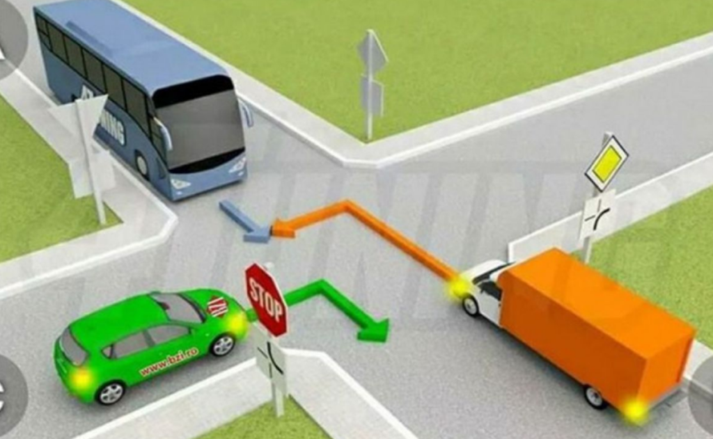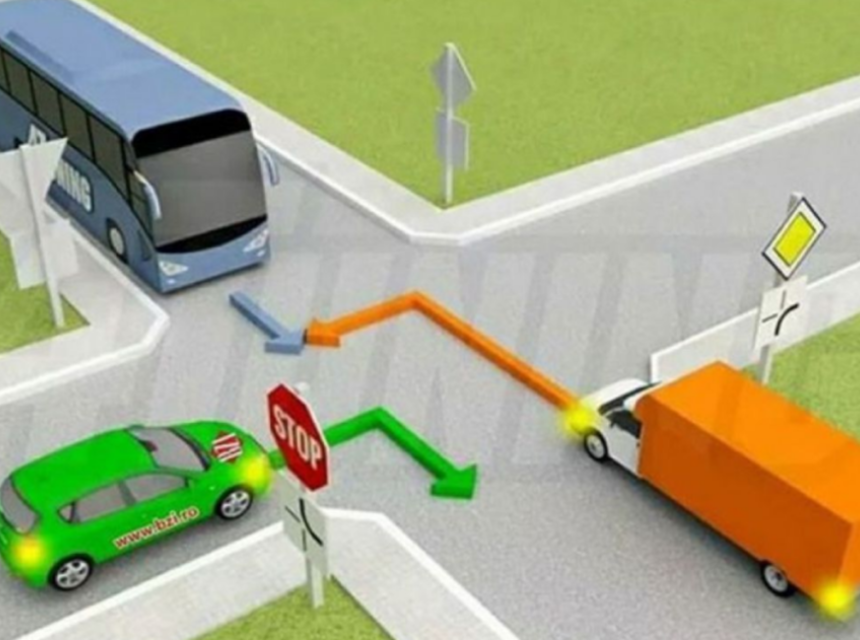 Naime, kao što se vidi na slici, na raskrsnici se nalaze kamion, automobil i autobus. Ispred kamiona stoji znak prvenstvo prolaza i on treba da skrene lijevo.