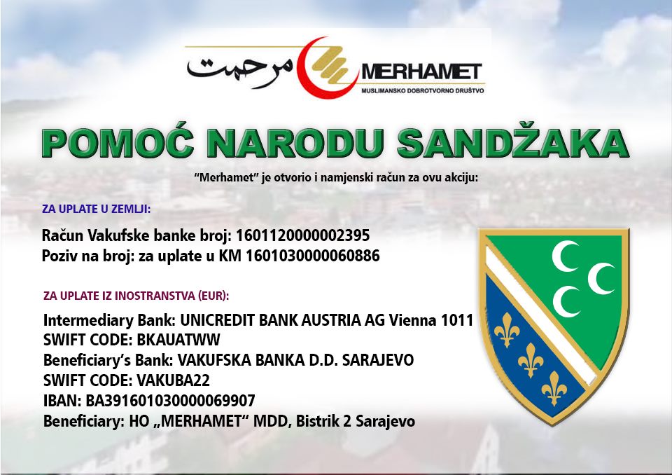 Muslimansko dobrotvorno društvo „Merhamet“ pokrenulo je danas Akcija pod nazivom „POMOĆ NARODU SANDŽAKA“. Akcija će trajati do 1. avgusta 2020. godine, s mogućnošću produženja.