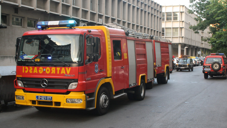 Prema izvještajima medija, vatrogasci pokušavaju otvoriti sigurnosna vrata zgrade kako bi bolje prišli stanu na četvrtom spratu iz kog kulja dim.