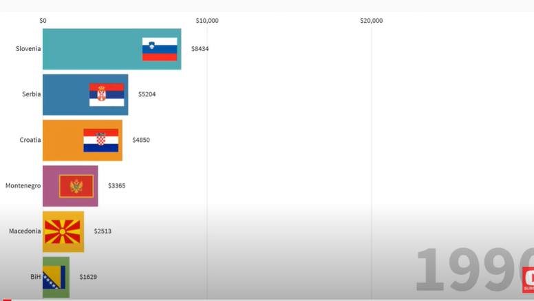 Video prikazuje kretanje BDP-a (bruto domaći proizvod) po stanovniku za zemlje bivše Jugoslavije - Bosnu i Hercegovinu, Hrvatsku, Makedoniju, Crnu Goru, Srbiju i Sloveniju, za razdoblje od 1990. do 2020.