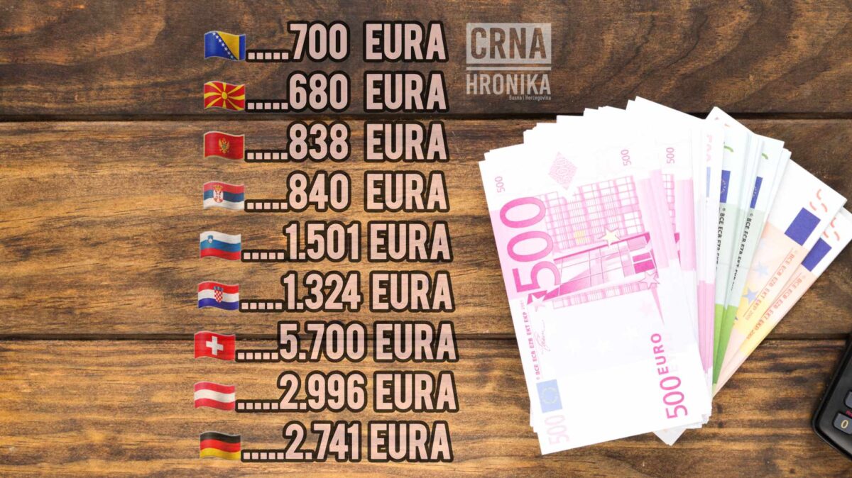 Prema posljednjim podacima prosječna isplaćena plaća za juni u Sloveniji je bila 1.501,97 eura, Crnoj Gori 838 eura a Sjevernoj Makedoniji 680,70 eura.