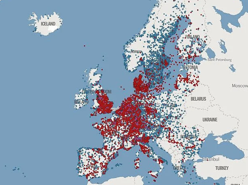 Na spomenutoj internetskoj stranici je objavljena i mapa zagađenja "trajnim hemikalijama" na Starom kontinentu. Kako je objašnjeno, crvenom su označena vodna područja za koja se zna da su kontaminirana PFAS-om. Nijanse crvene su određene shodno tome koliko je zagađenje (od 10 do 100 nanograma po litru, od 100 do 1.000 nanograma po litru, od 1.000 do 10.000 nanograma po litru te više od 10.000 nanograma po litru).
