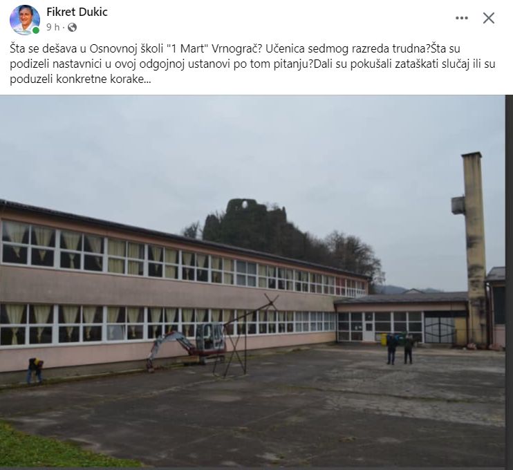- Šta se dešava u Osnovnoj školi "1. Mart" Vrnograč? Učenica sedmog razreda trudna? Šta su poduzeli nastavnici u ovoj odgojnoj ustanovi po tom pitanju? Da li su pokušali zataškati slučaj ili su poduzeli konkretne korake – navodi se u njegovoj objavi.
