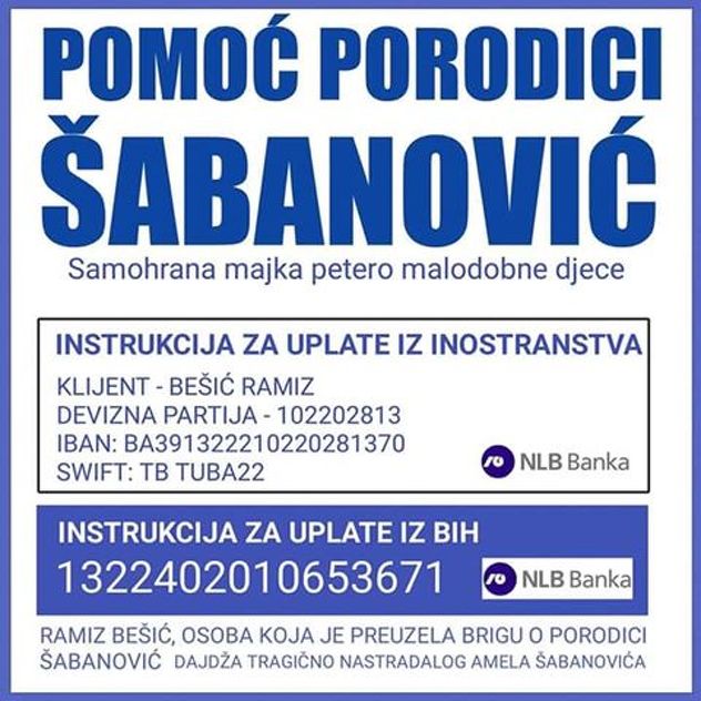 Oba računa glase na ime osobe koja je preuzela brigu o poridici Šabanović, Ramiz Bešić Ramija - daidža tragično nastradalog Amela Šabanovića iza kojeg je ostala supruga Indira i petero malodobne djece, a koji su trenutno u stanju velike potrebe.