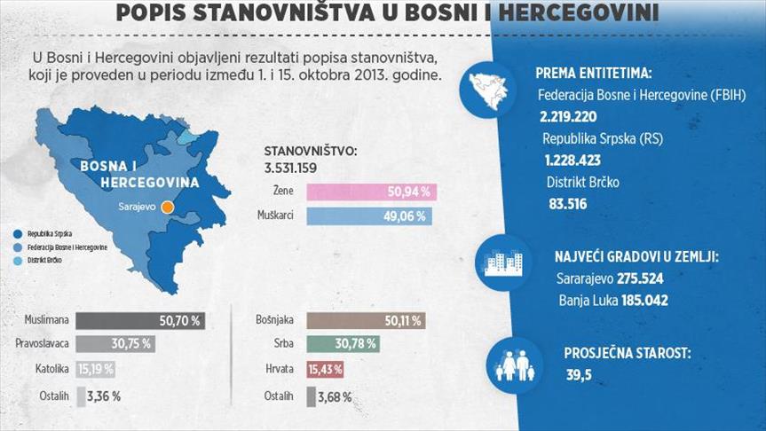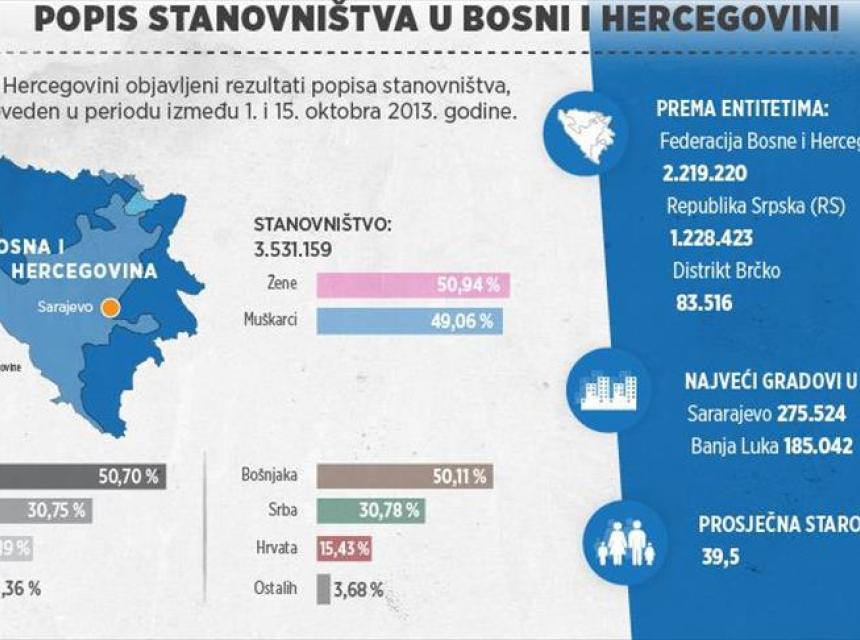 Prema rezultatima popisa stanovništva iz 2013. godine u BiH je živjelo 3.531.159 stanovnika. Od toga, u Federaciji BiH 2.219.220 (62,85 posto), u Republici Srpskoj 1.228.423 (34,79 posto) te u Distriktu Brčko 83.516 stanovnika (2,37 posto). Jedini poslijeratni popis u BiH koštao je oko 45 miliona maraka.
