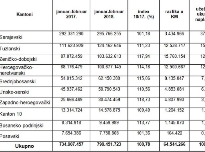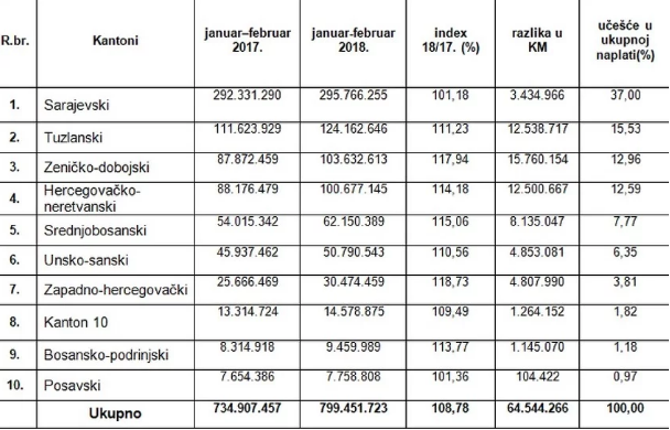 Porezni obveznici Federacije BiH su u periodu januar - februar 2018. godine uplatili 799.451.723 KM javnih prihoda, što je za 64.544.266 KM više u odnosu na januar - februar 2017. godine, odnosno više za 8,78 posto, podaci su Porezne uprave FBiH.