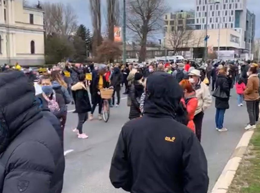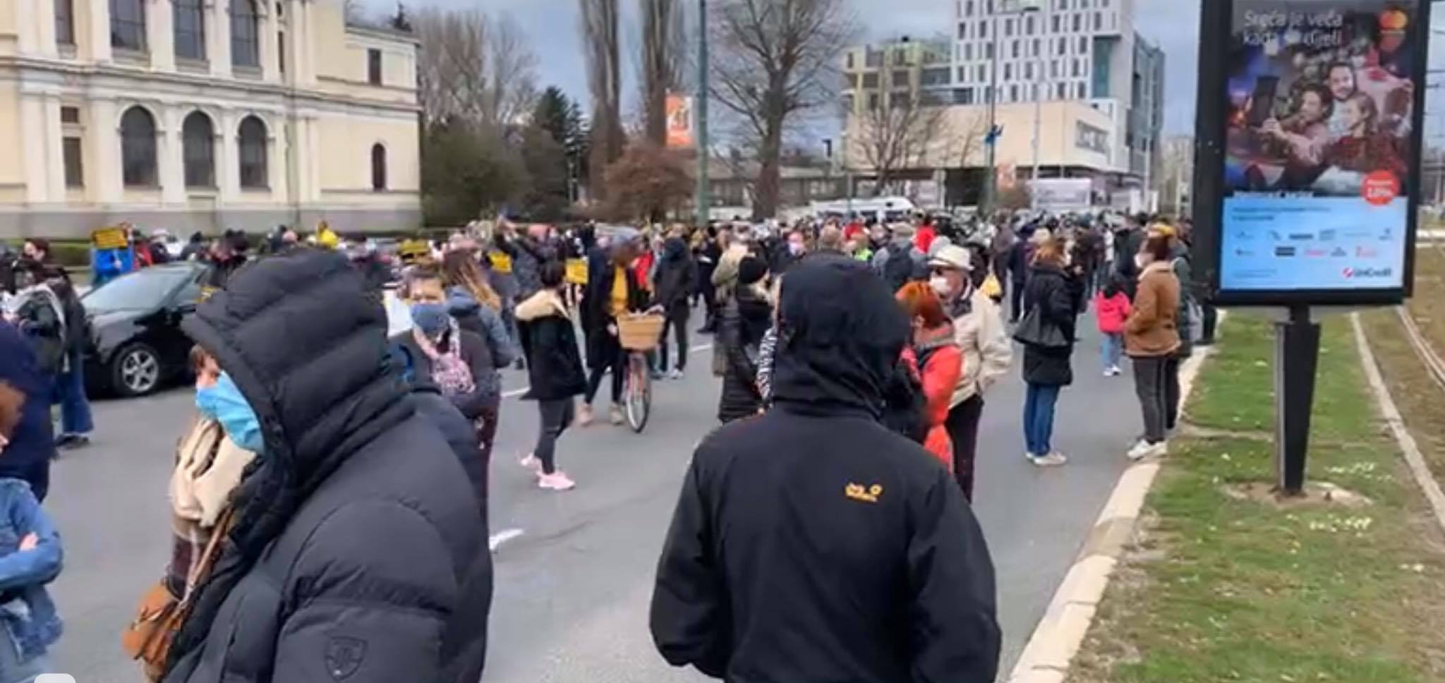 Oni koji su se okupili pješice nose jednoobrazne žuto-crne transparente na kojima piše: "Vakcine? Vakcine!", "Fadile, tvoj humor ubija", "Nek sjaše i Kurta i Murta", "Država nam je mjesto zločina"...
