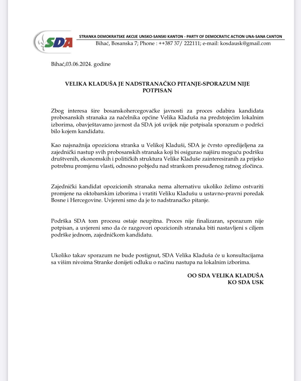 “Zbog interesa šire bosanskohercegovačke javnosti za proces odabira kandidata probosanskih stranaka za načelnika općine Velika Kladuša na predstojećim lokalnim izborima, obavještavamo javnost da SDA još uvijek nije potpisala sporazum o podršci bilo kojem kandidatu.