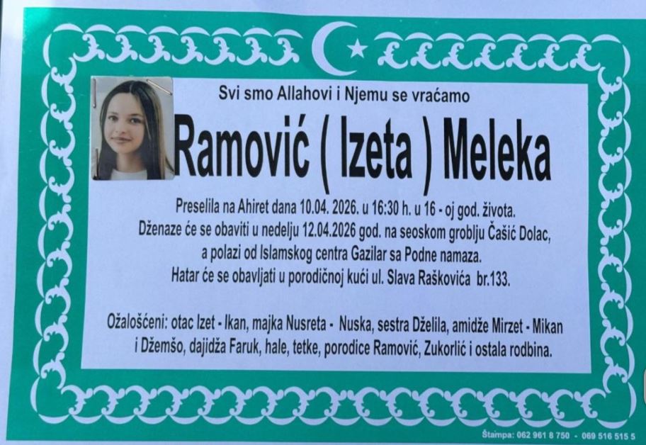 Dženaza namaz biće obavljena u nedjelju, 12. aprila 2026. godine, na seoskom groblju Čašić Dolac, dok će polazak biti iz Islamskog centra Gazilar, nakon podne-namaza. Porodica će hatar primati u porodičnoj kući u ulici Slava Raškovića broj 133. Iza Meleke su ostali neutješni roditelji – otac Izet i majka Nusreta, sestra Džella, kao i brojna rodbina, prijatelji i školski drugovi koji se opraštaju od djevojčice čiji je život bio tek na početku.