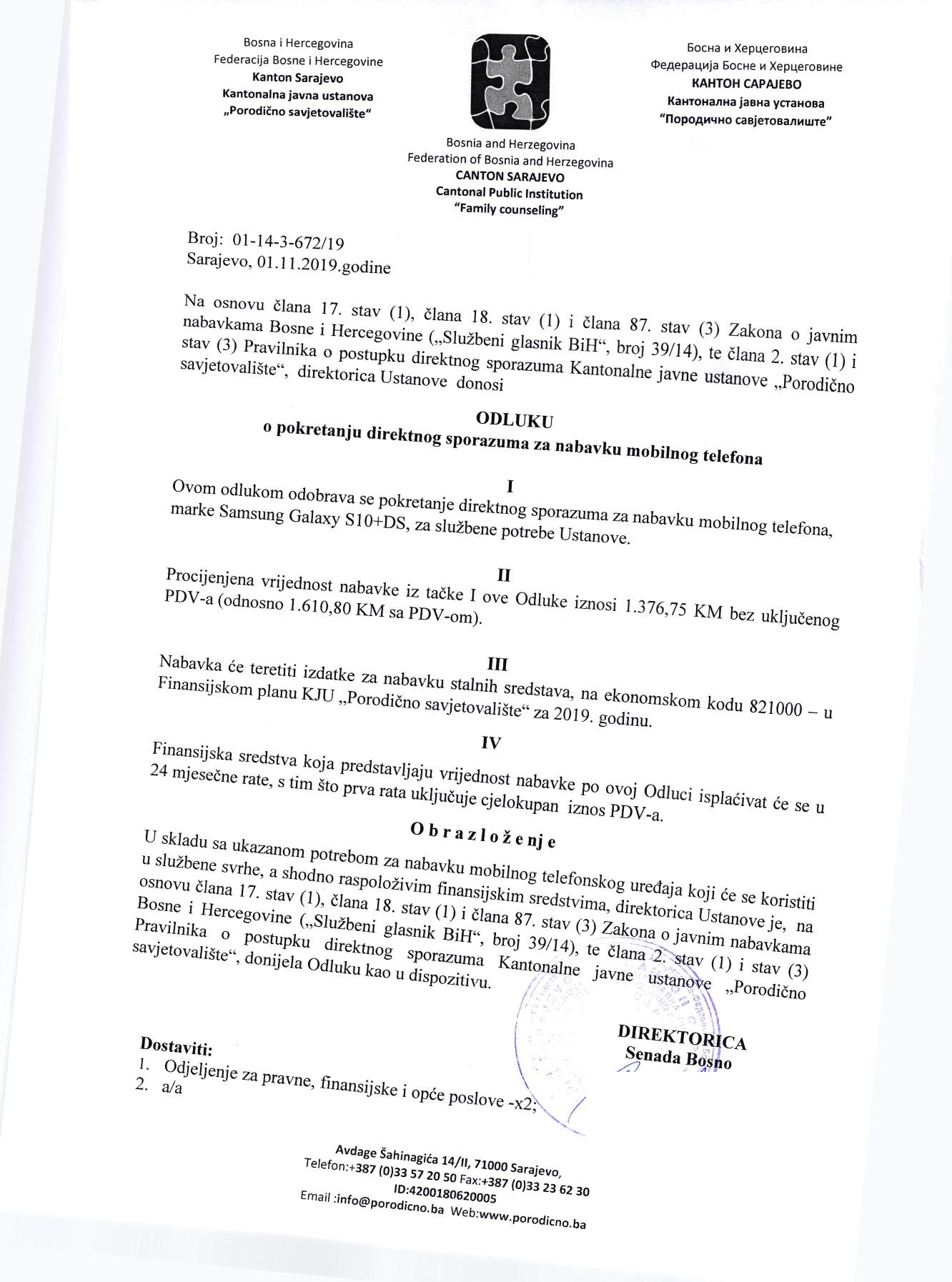 Neprihvatljivo je za Bosno da koristi stariji model telefona. Zato je 1. novembra prošle godine u svojstvu direktorice KJU “Porodično savjetovalište” potpisala odluku o pokretanju direktnog sporazuma za nabavku mobilnog telefona Samsung Galaxy S10+DS.