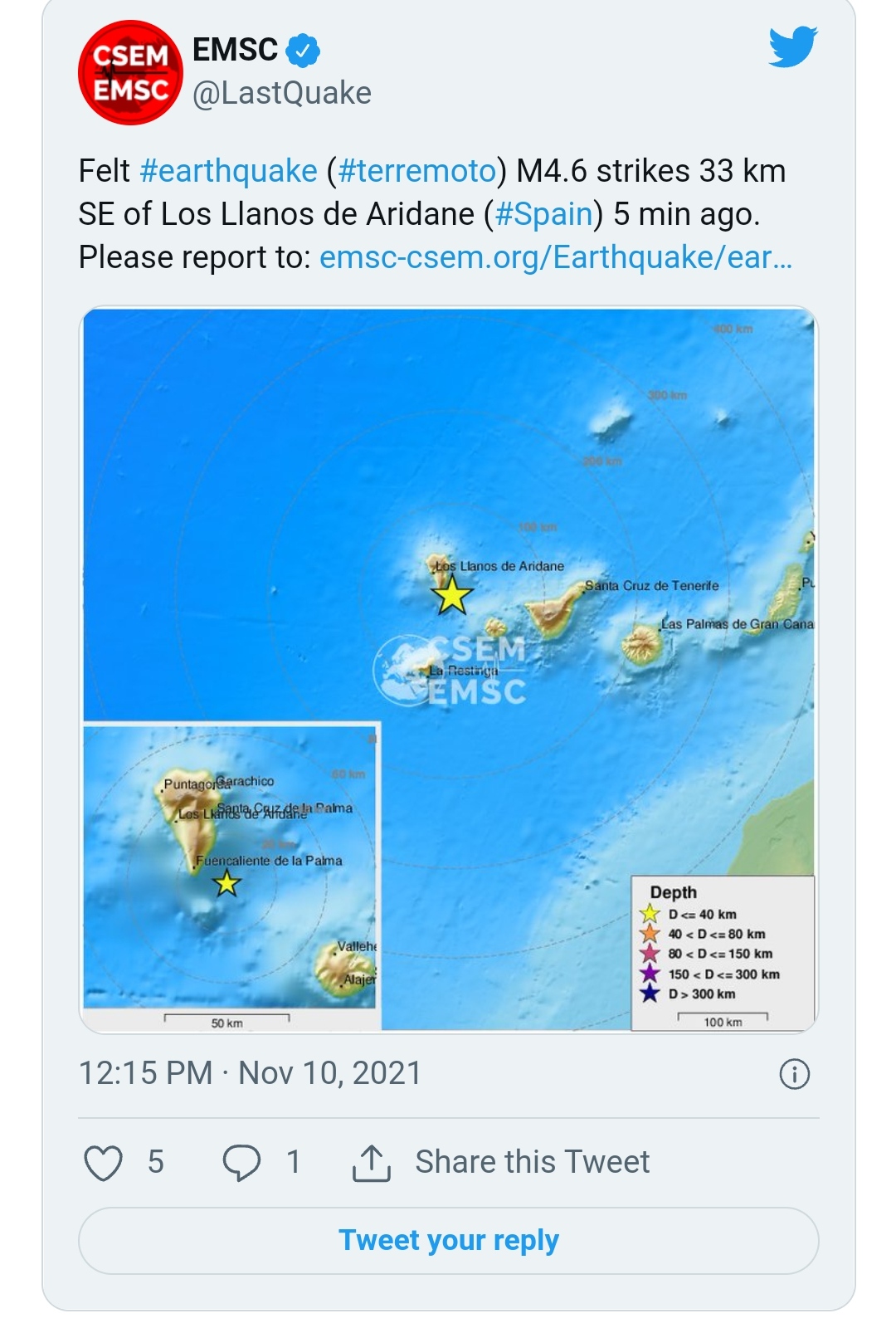 SVIJET 10 Nov, 2021 - 12:39 / Uredio: AzraS / 0 Comments Potres magnitude 4.6 na Kanarskim otocima U ŠPANJOLSKOJ je u 12:10 zabilježen potres magnitude 4.6. Epicentar je bio na dubini od 22 kilometra te 21 kilometar udaljen od grada Mazo (Kanarski otoci). potres Related Articles SVIJET 05 Dec, 2025 Ubijen Abu Shabab: Vođa proizraelske milicije stradao u Gazi pod sumnjivim okolnostima SVIJET 05 Dec, 2025 Trampova odluka o otpuštanju 250 ljudi blokirana na sudu SVIJET 04 Dec, 2025 Trump bi do Božića trebao objaviti drugu fazu plana za Gazu: Evo šta bi ona trebala podrazumijevati BOSNA I HERCEGOVINA SVIJET 04 Dec, 2025 Severe Weather | Objavljena prognoza za iduća tri mjeseca: Poznato kakva nas zima čeka u BiH SVIJET 04 Dec, 2025 Izraelu dozvoljeno da se takmiči na Eurosongu, Nizozemska i Španija odustaju od učešća SVIJET 04 Dec, 2025 Kadirov zaprijetio Evropi: Čečenske snage samo čekaju signal iz Moskve. Spremni smo za rat!